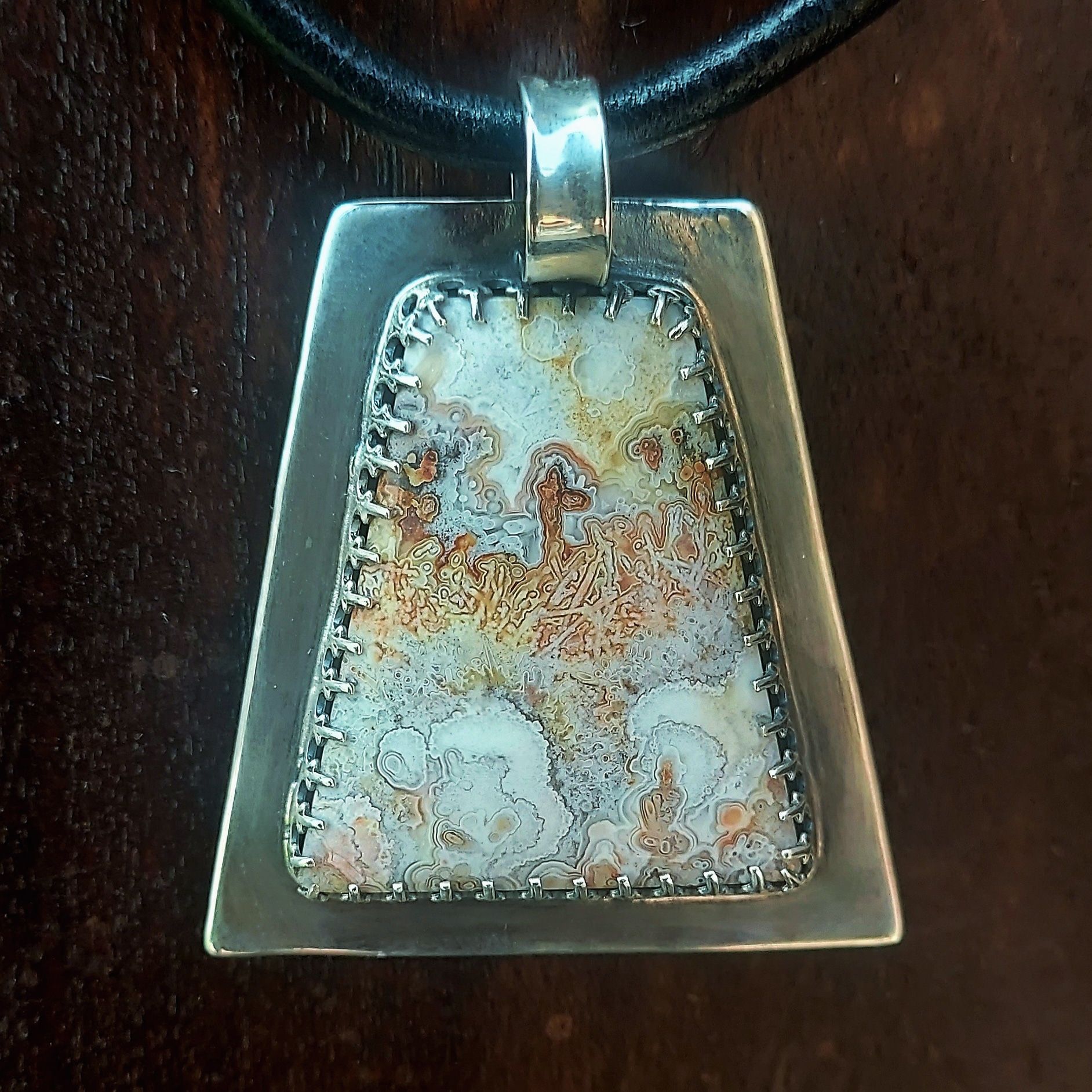 Crazy Lace Agate set in Sterling Silver. This hangs from a thick leather rope with a Sterling Silver clasp. If interested, please contact me directly.